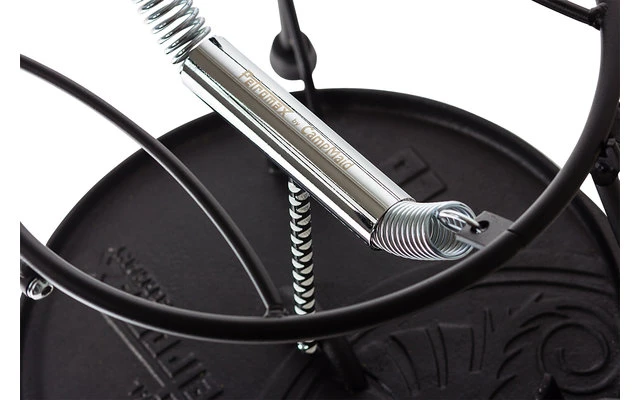 Coloque las tres patas del soporte de la tapa sobre su olla de fuego, presione el resorte y enganche en el mango de la tapa. De este modo, el soporte de la tapa se convierte en un levantador de tapas: basta con retirarlo y dejarlo a un lado. Como la tapa de la olla fija no toca el suelo cuando se coloca, el interior de la tapa permanece libre de suciedad. Especialmente práctico: el soporte de la tapa de tres patas también puede servir como soporte para servir cuando se coloca la olla de fuego en él.